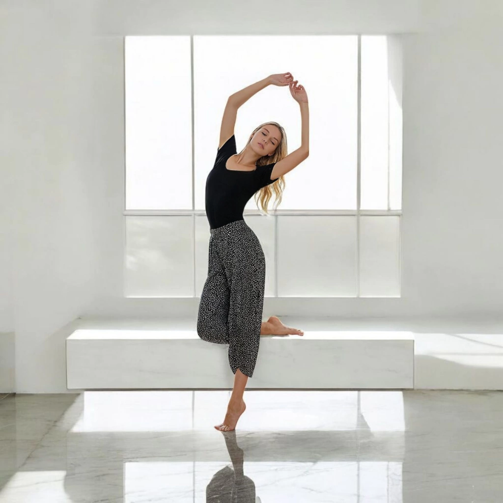 Sinta a leveza e a liberdade do conjunto comfy de viscolycra que traduz seu desejo em movimento. A blusa com decote canoa realça o colo com uma sutileza delicada, enquanto a pantacourt preta com bolinhas brancas fluida, com recortes, une leveza e conforto em cada detalhe.