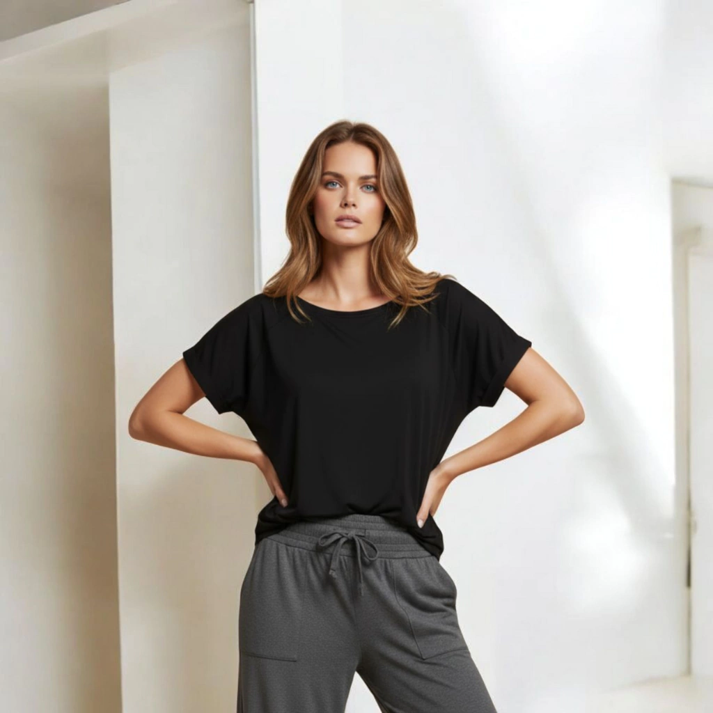Sinta a leveza e a liberdade do conjunto comfy de viscolycra que traduz seu desejo em movimento. A blusa com decote canoa realça o colo com uma sutileza delicada, enquanto a pantalona fluida, com bolso embutido, une elegância e descontração em cada detalhe.