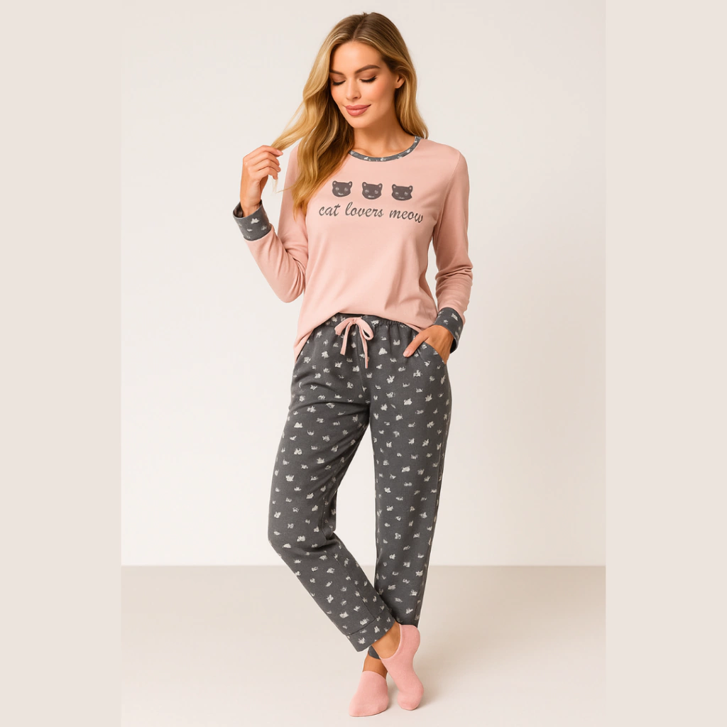 Descubra o charme e a suavidade do Conjunto de Pijama Feminino Outono Inverno Gata Meow!, perfeito para quem busca conforto e estilo nas noites mais fresquinhas. Composto por uma camisa rosa delicada com a escrita "Cat loves Meow" e uma calça de algodão com a encantadora estampa da Gata Meow, este pijama é a escolha ideal para você relaxar com muito aconchego.